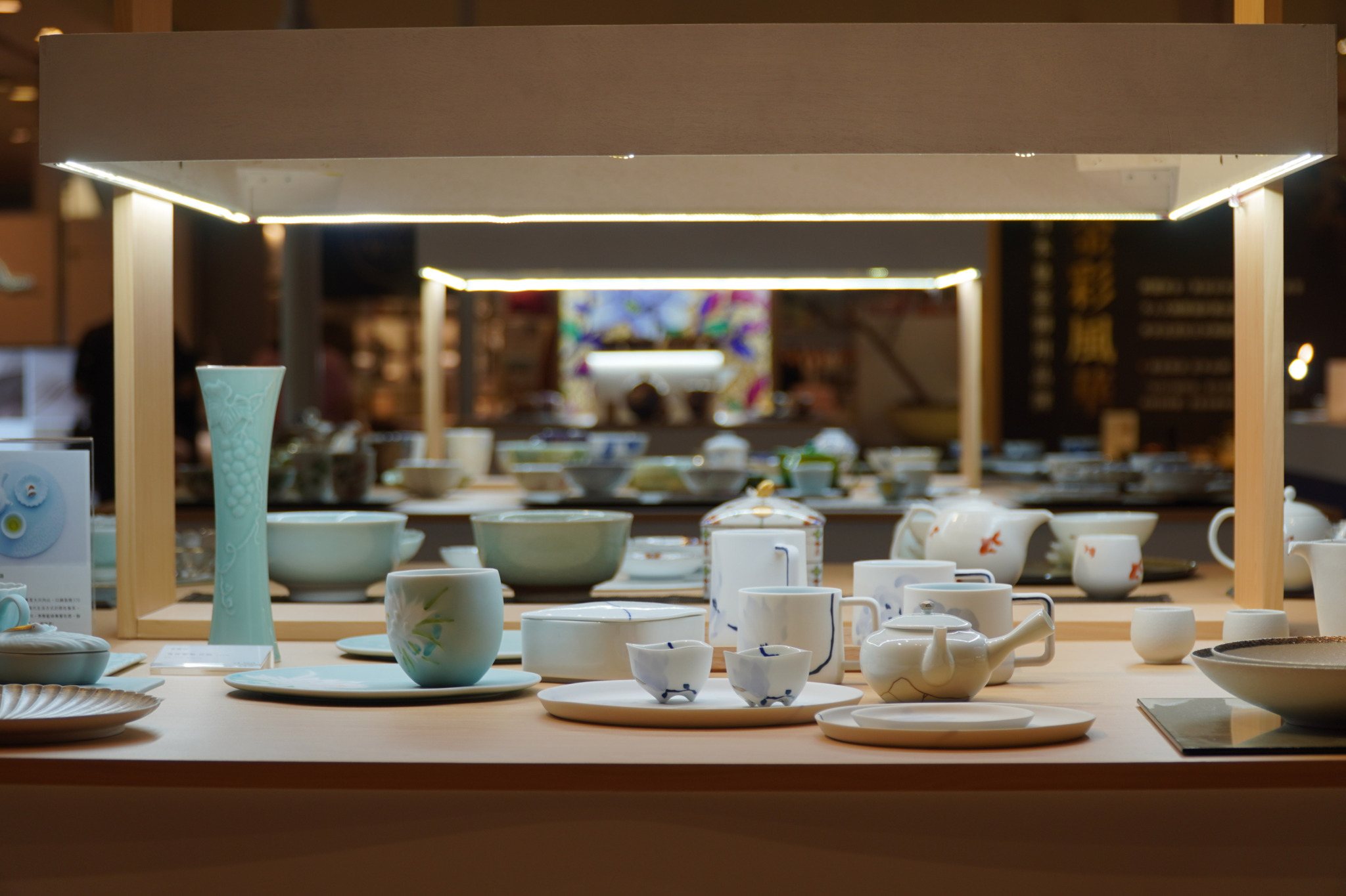 柔和的環境燈光突顯了食器的質感與細節,搭配重點照明強調特選商品,營造出溫暖且吸引人的氛圍,讓顧客願意駐足觀賞並欣賞每件餐具的精湛工藝。