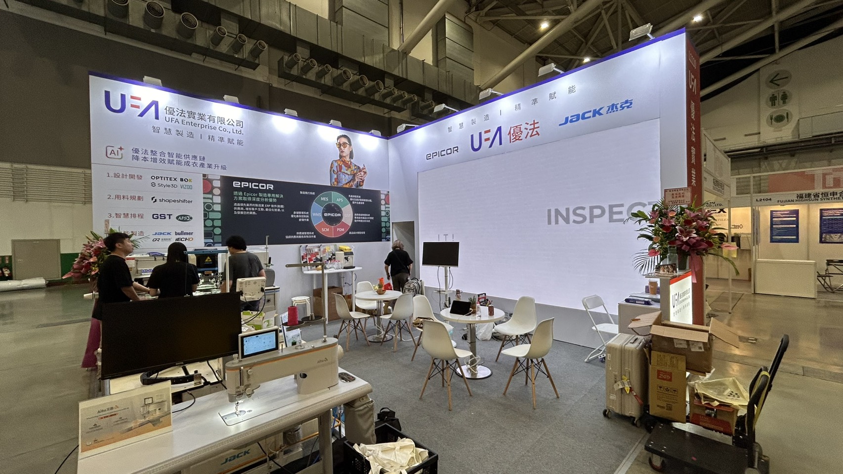 今年,我們為優法實業打造一座「從機能產品線到製程設備線」雙主軸展位。觀展者走過一圈,就能把功能布料的性能,直接對到背後的設備能力與管控節點:規格不是口號,而是流程與數據的總和。
