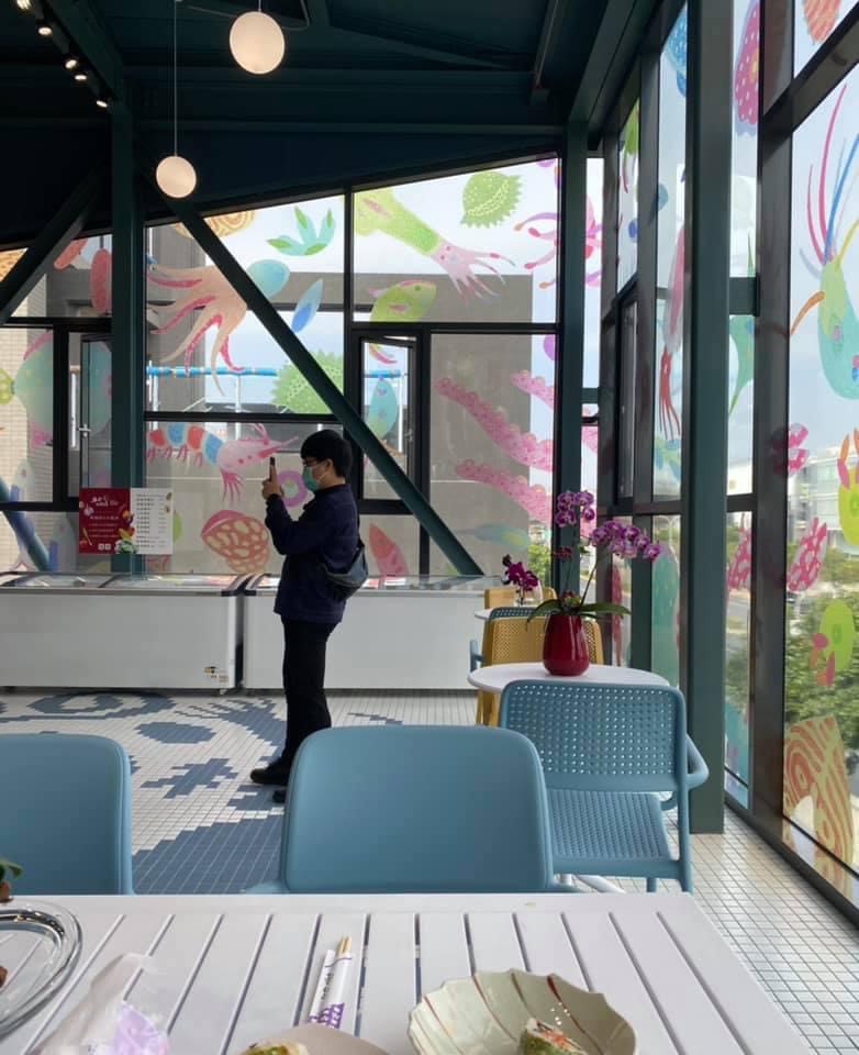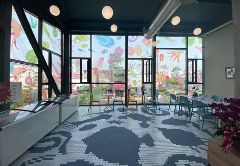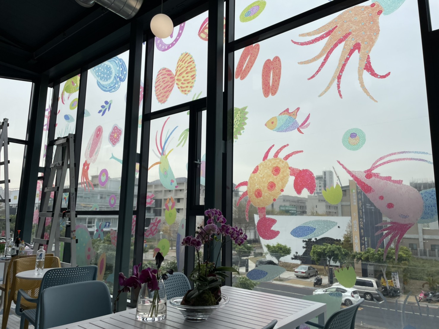 此次的玻璃窗貼施工,於2樓室外的玻璃上採用了3M 超透明PVC玻璃貼,運用色彩鮮豔活潑有趣的海底生物方式呈現企業販售海鮮的鮮明形象,同時也達到外部整體裝潢的點綴亮點,有效提升店面視覺效果。