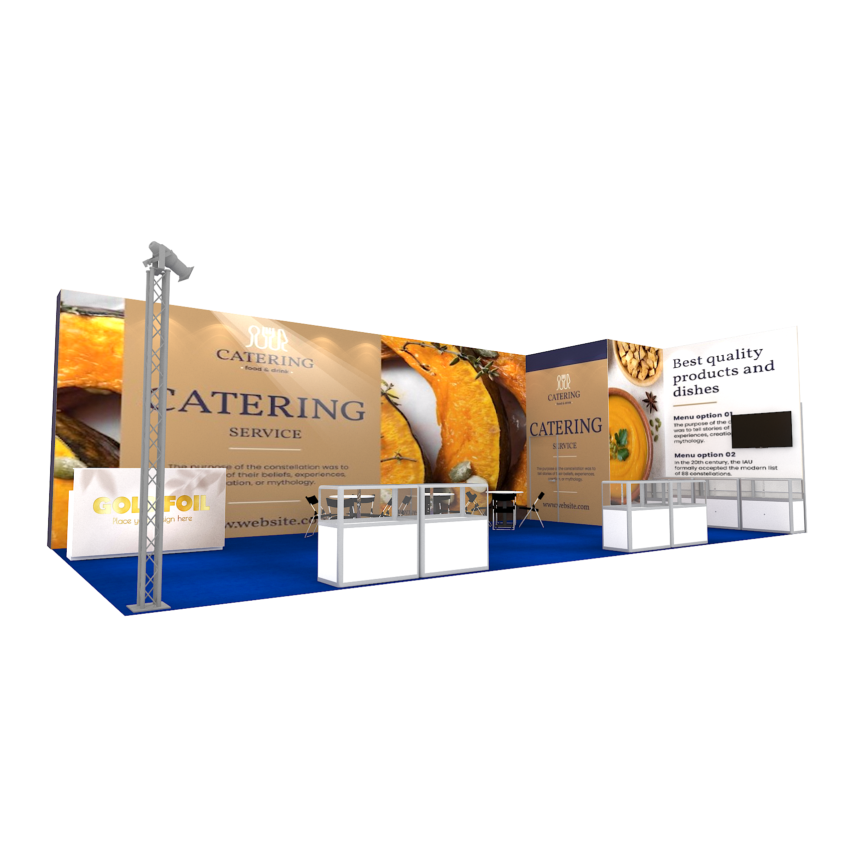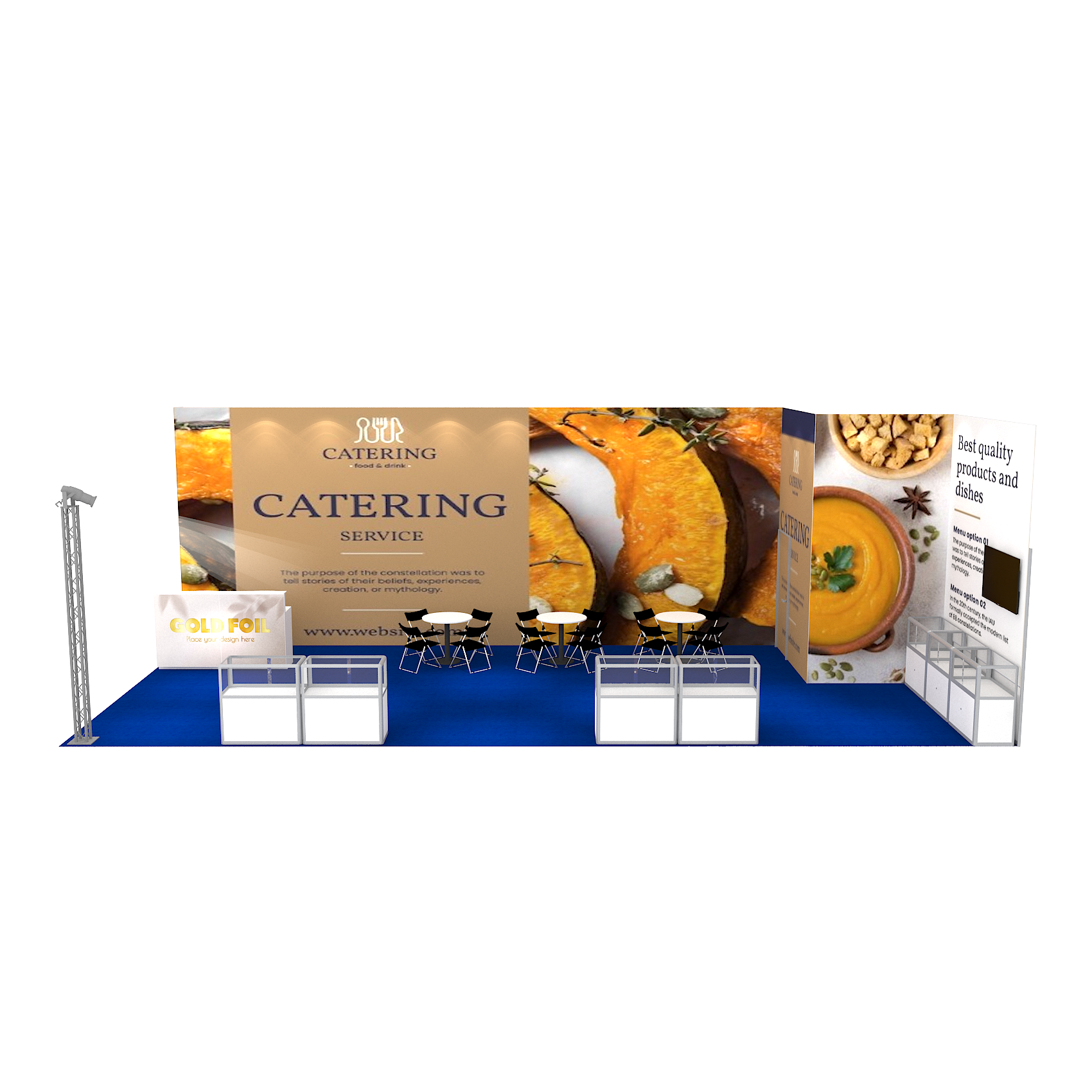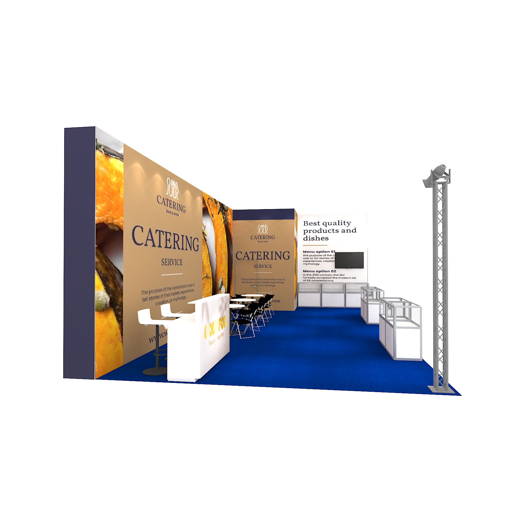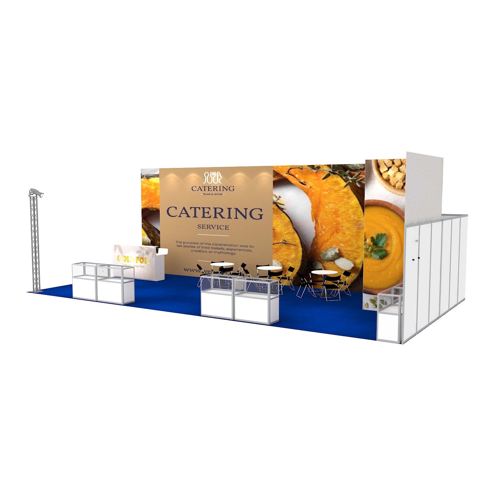 套裝攤位裝潢包含以下: • 攤位大小:600X1200cm • 展位高度:400cm • 大圖輸出:1式 • 組合隔間:1式 • TRUSS燈柱:1式 • 地毯:(可選基本色系) • 70w燈具:18盞 • PAR燈:4個 • 插座:2個(110V/5A) • 燈箱櫃台:2座 • 玻璃展櫃:7座 • 電視:1台 • 圓桌:3張 • 摺疊椅(黑):12張 • 吧檯椅:2張 • 木門:1組 • 進撤場施工(林口以南需加車資)