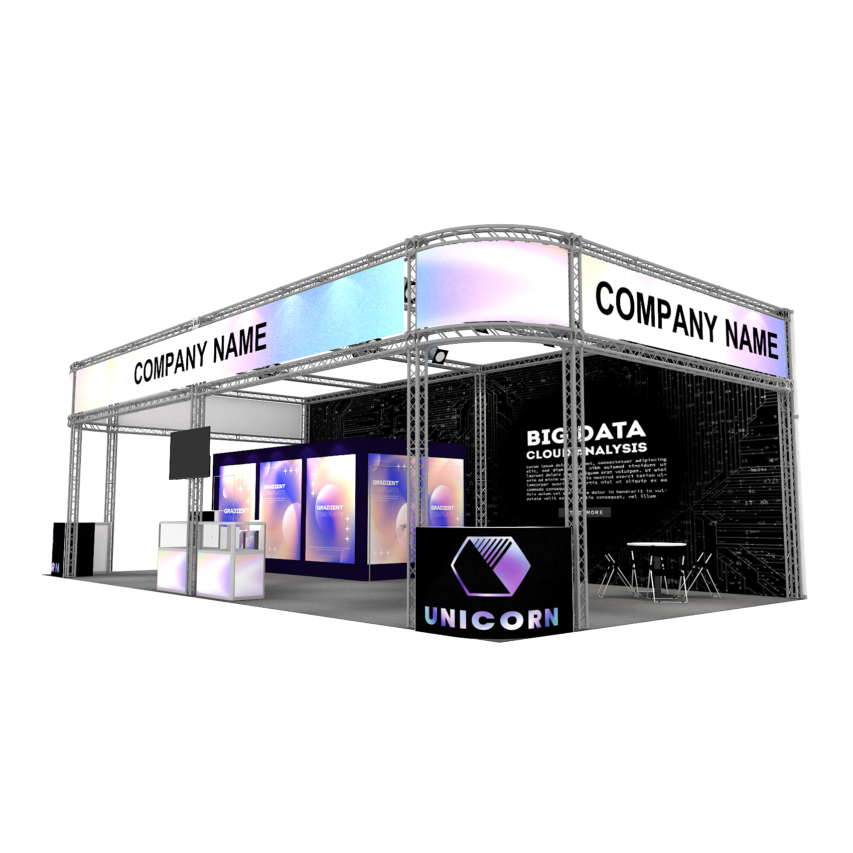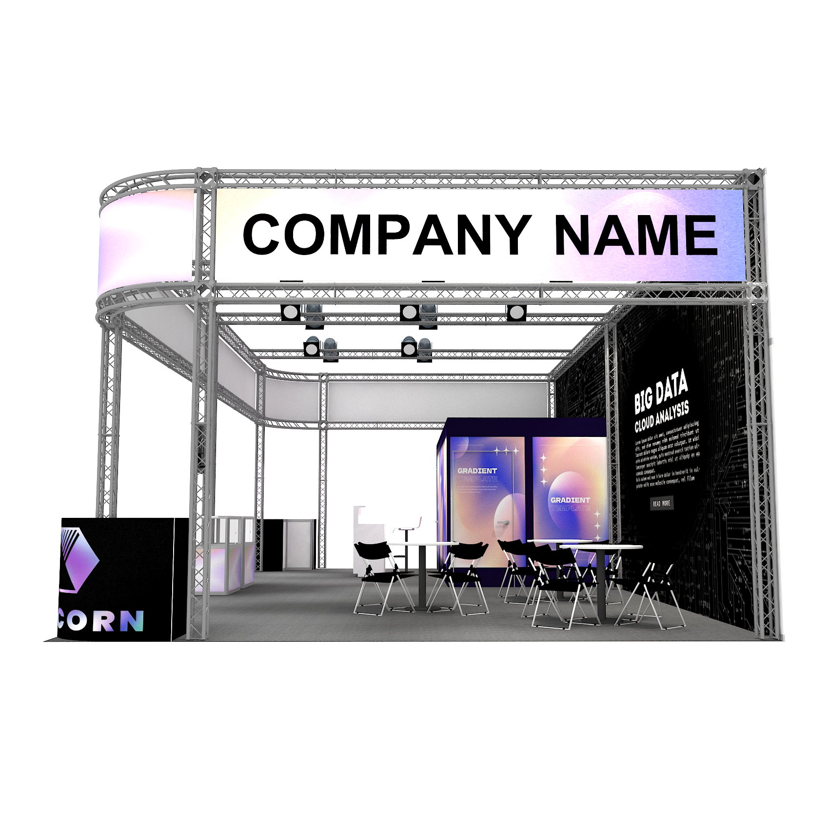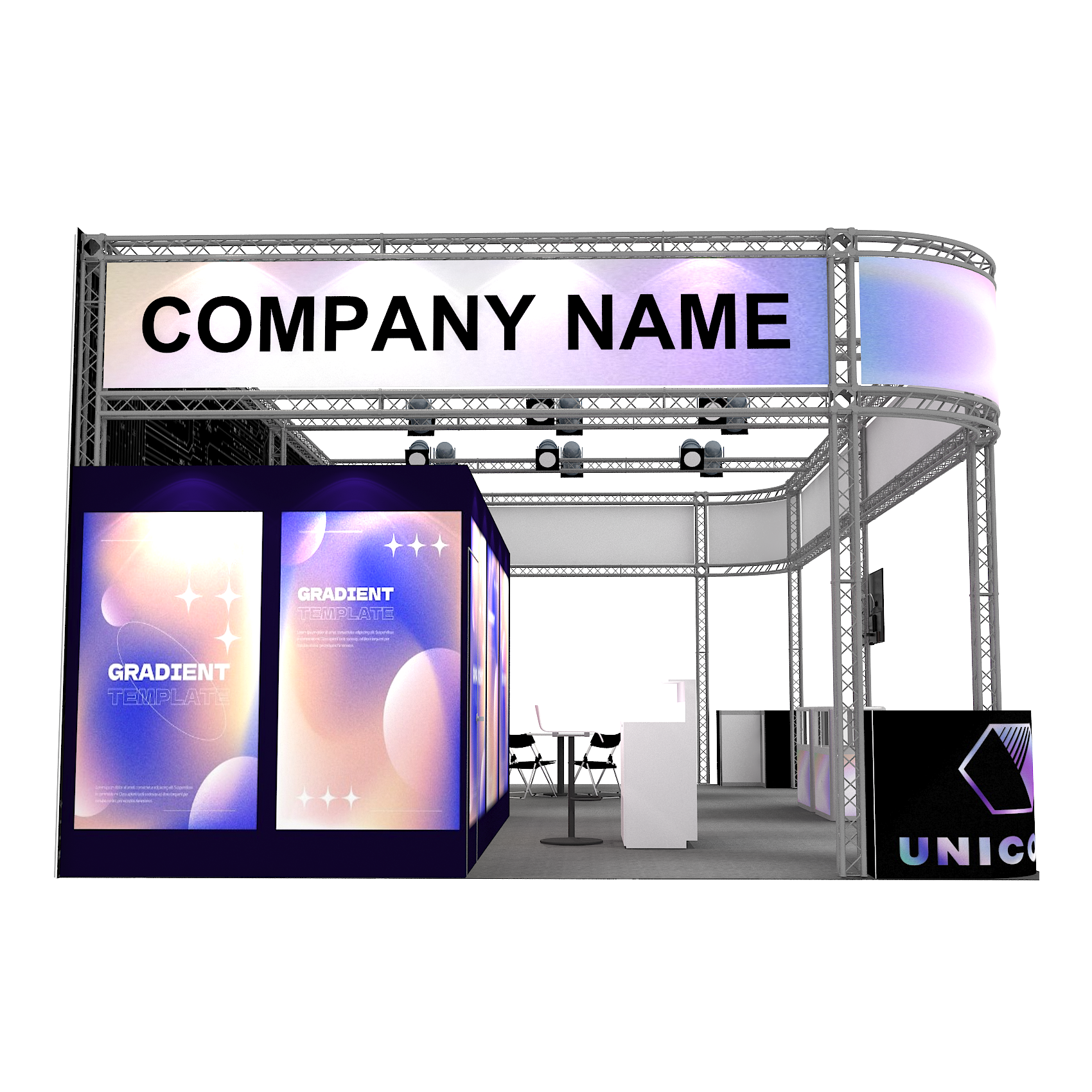 套裝攤位裝潢包含以下: • 攤位大小:600X1200cm • 展位高度:400cm • 大圖輸出:1式 • 組合隔間:1式 • TRUSS:1式 • 地毯:(可選基本色系) • 70w燈具:35盞 • PAR燈:4個 • 插座:2個(110V/5A) • 燈箱櫃台:1座 • 玻璃展櫃:2座 • 展櫃:6 座 • 電視:1台 • 圓桌:4張 • 摺疊椅(黑):16張 • 吧檯椅:1張 • 木門:1組 • 進撤場施工(林口以南需加車資)