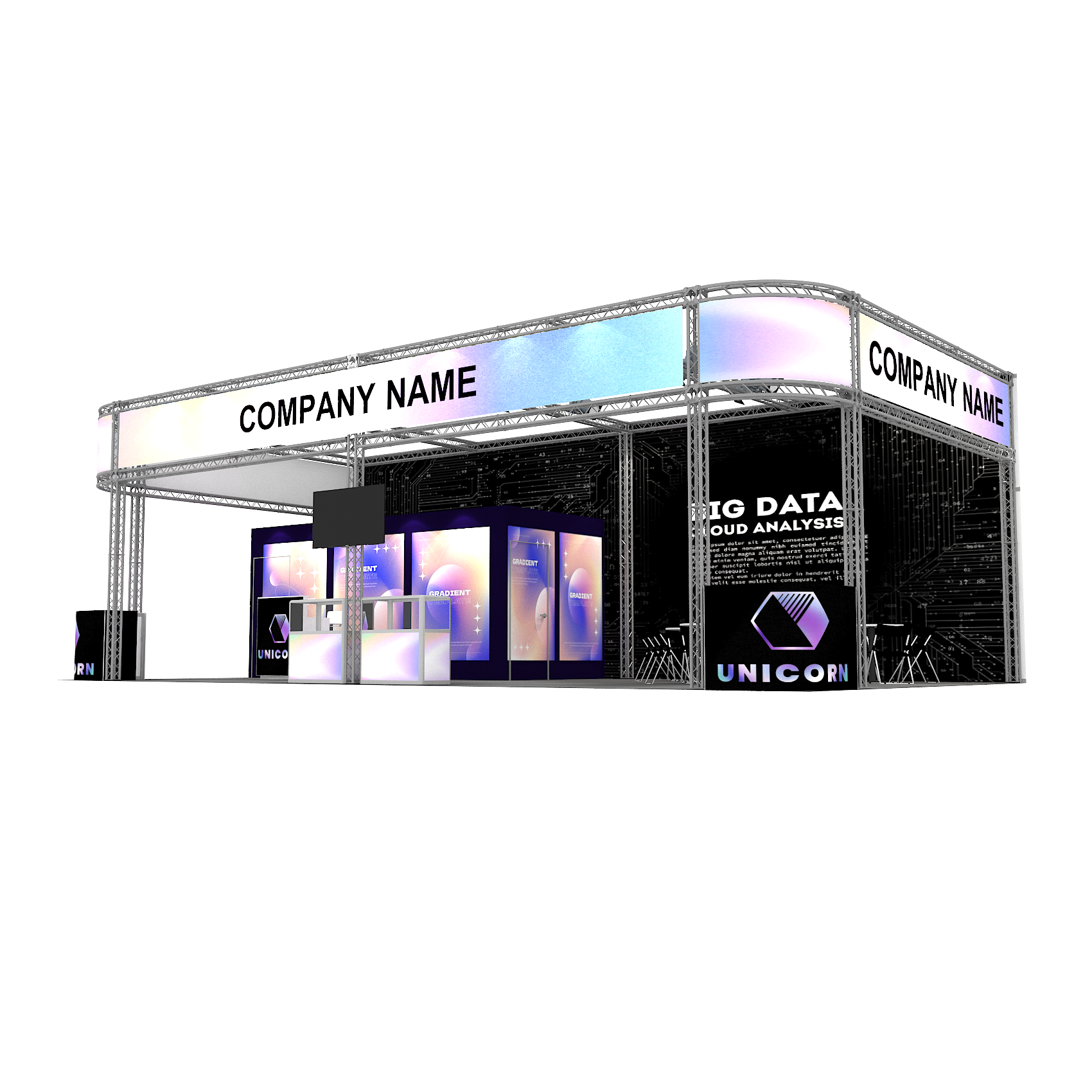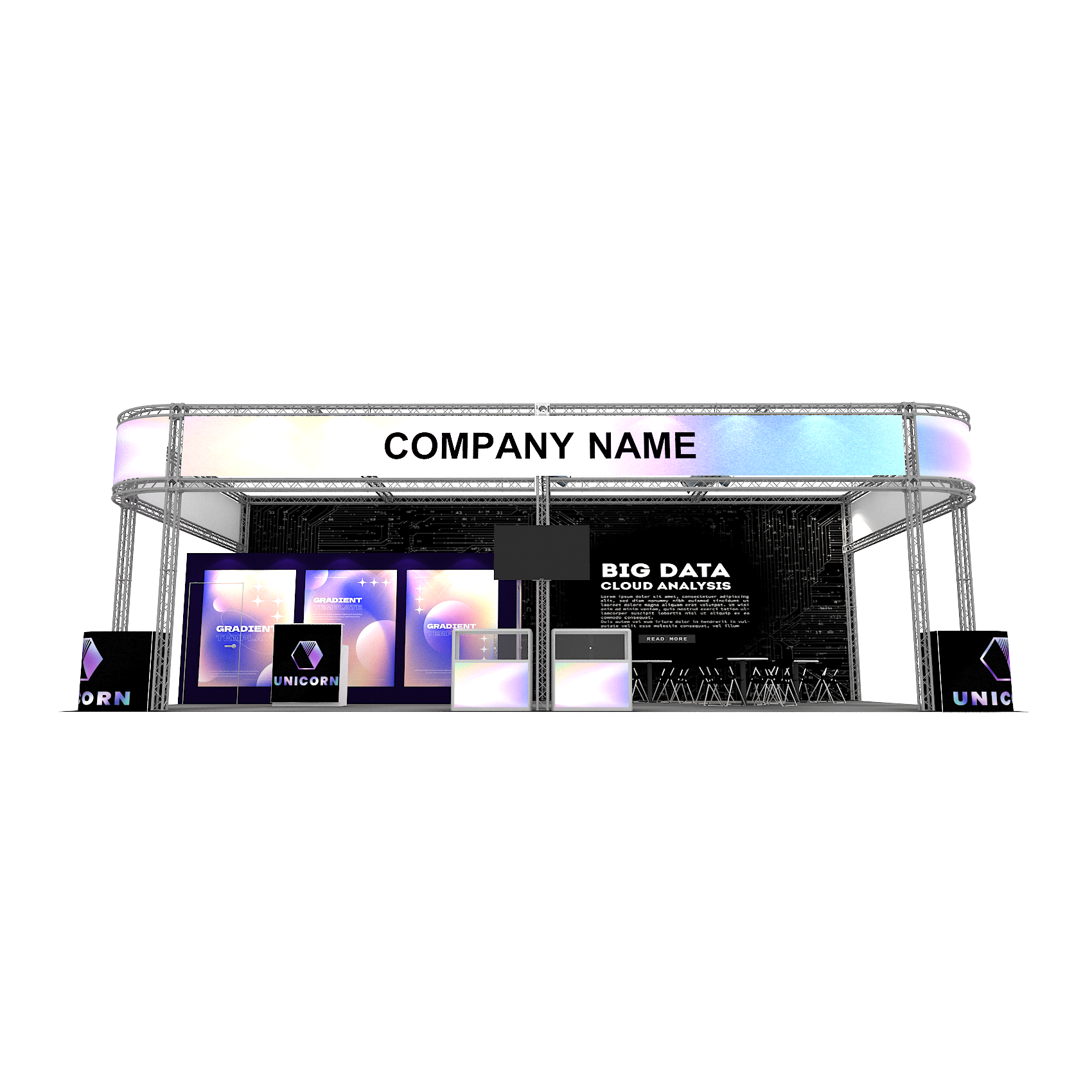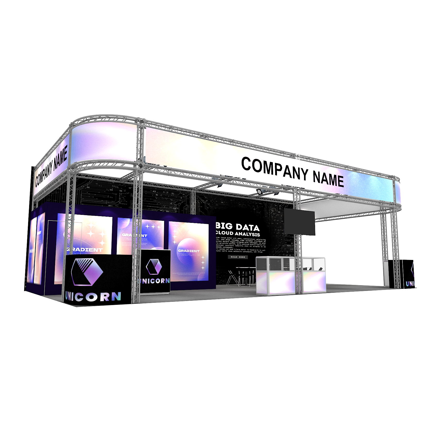 套裝攤位裝潢包含以下: • 攤位大小:600X1200cm • 展位高度:400cm • 大圖輸出:1式 • 組合隔間:1式 • TRUSS:1式 • 地毯:(可選基本色系) • 70w燈具:35盞 • PAR燈:4個 • 插座:2個(110V/5A) • 燈箱櫃台:1座 • 玻璃展櫃:2座 • 展櫃:6 座 • 電視:1台 • 圓桌:4張 • 摺疊椅(黑):16張 • 吧檯椅:1張 • 木門:1組 • 進撤場施工(林口以南需加車資)