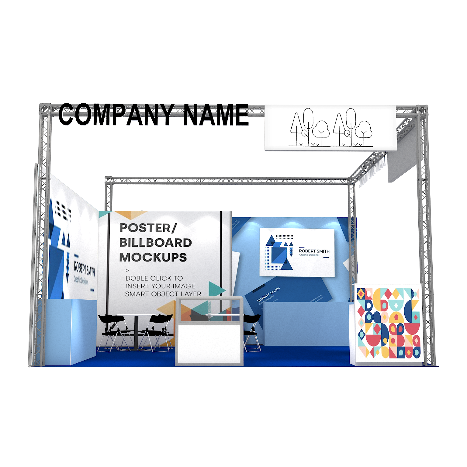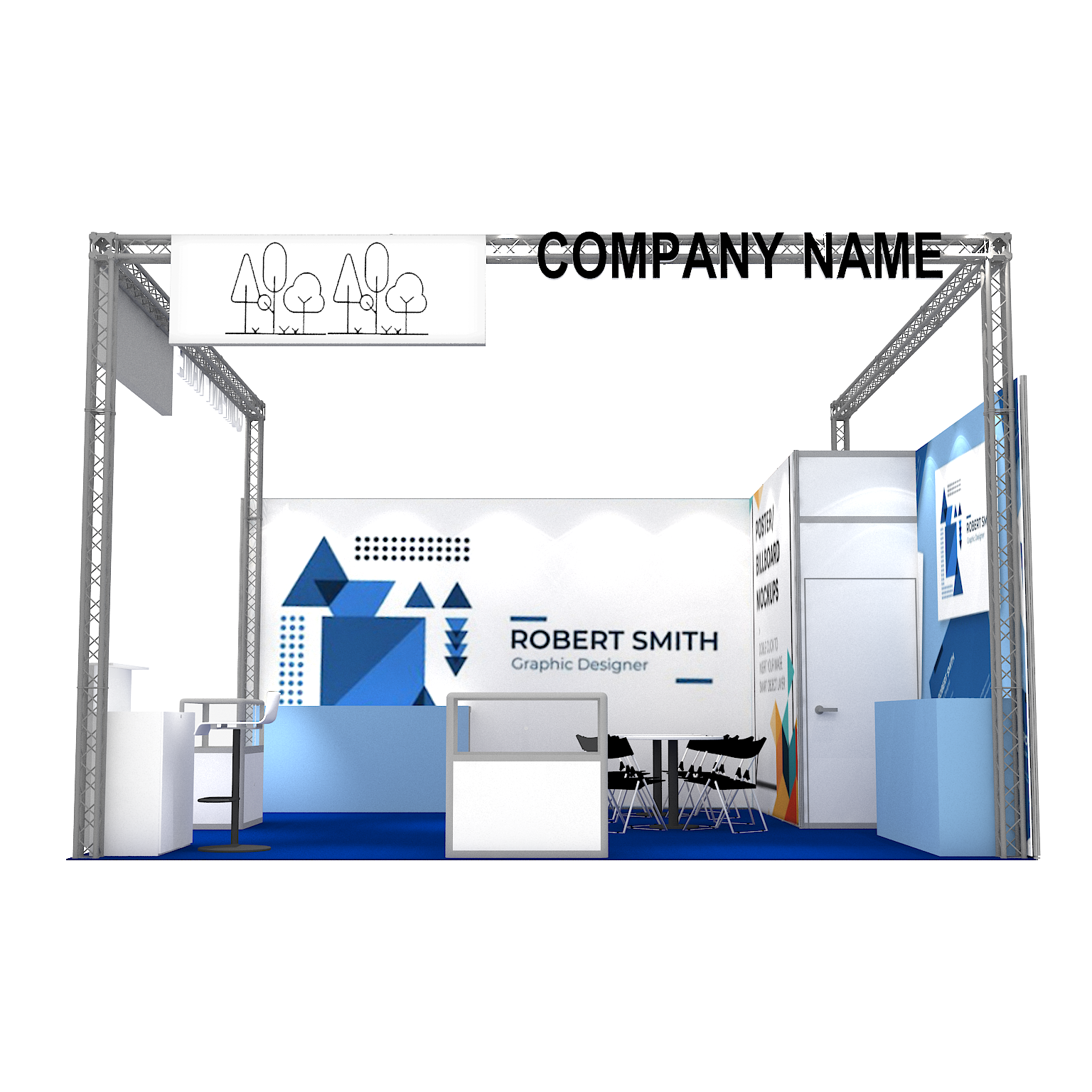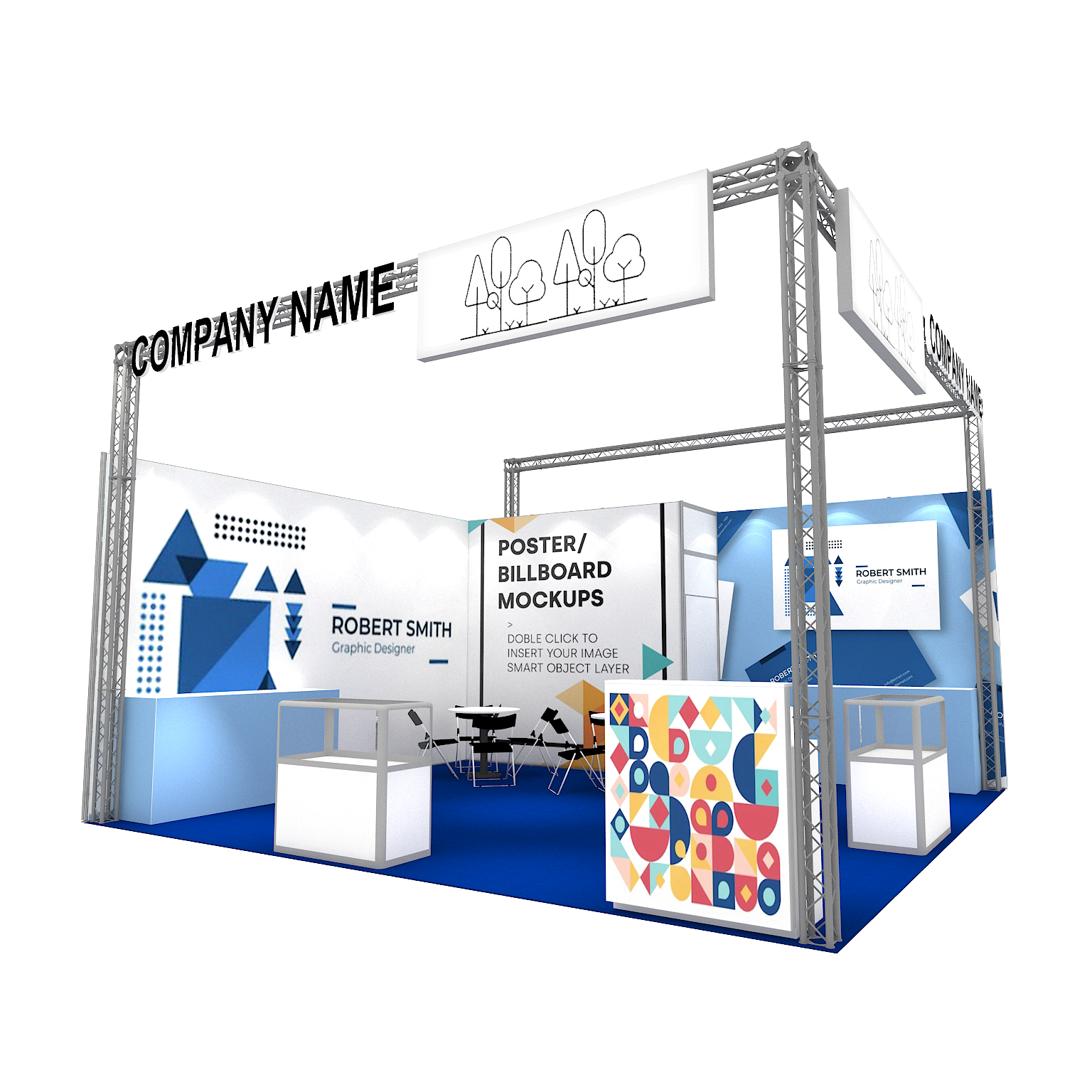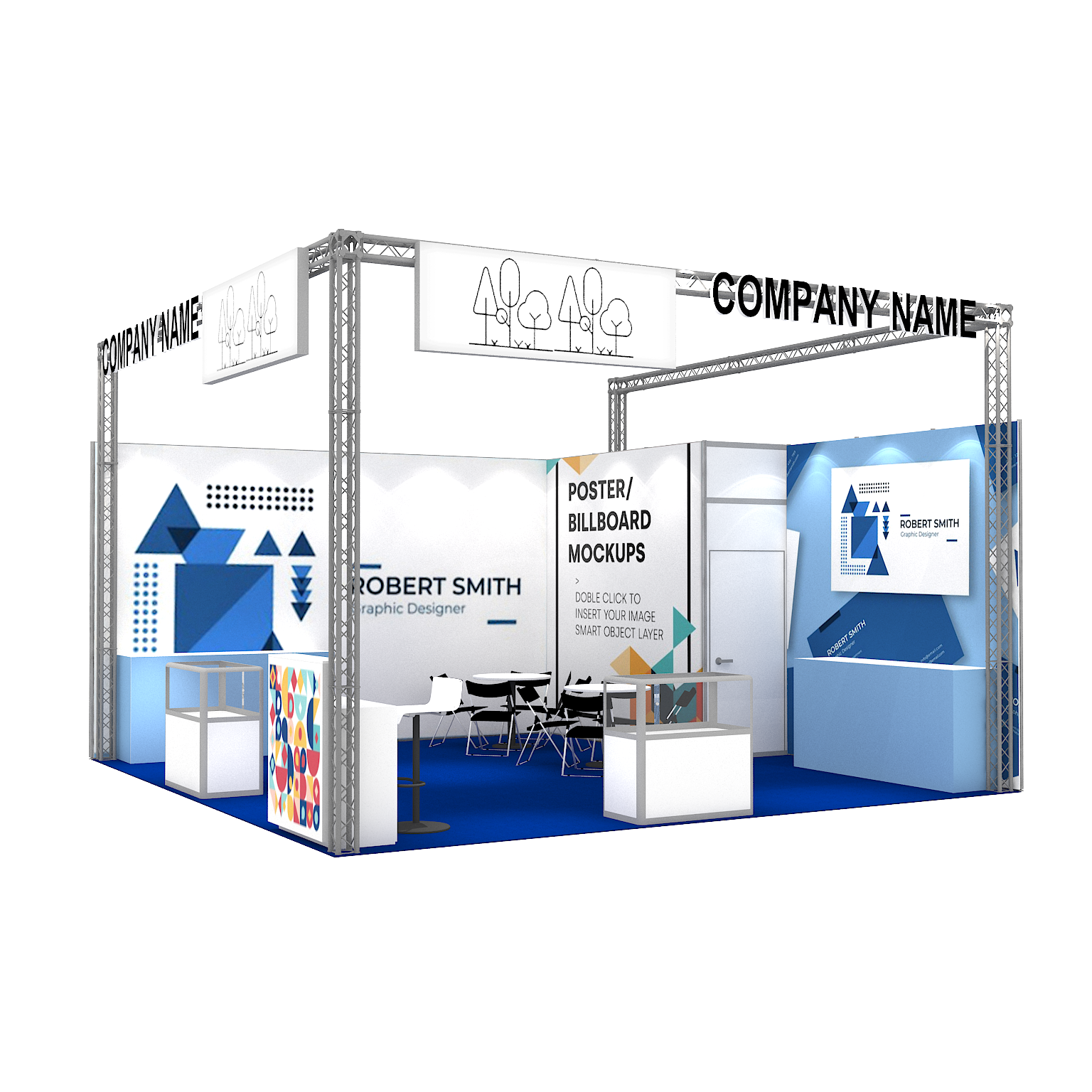 套裝攤位裝潢包含以下: • 攤位大小:600X600cm • 展位高度:400cm • 大圖輸出:1式 • 組合隔間:1式 • 地毯:(可選基本色系) • 70w燈具:20盞 • 插座:2個(110V/5A) • 燈箱櫃台:1座 • 玻璃展櫃:2座 • 展櫃:4座 • 圓桌:2張 • 摺疊椅(黑):8張 • 吧檯椅:1張 • 電視:1台 • 立體字:1組 • 進撤場施工(林口以南需加車資)