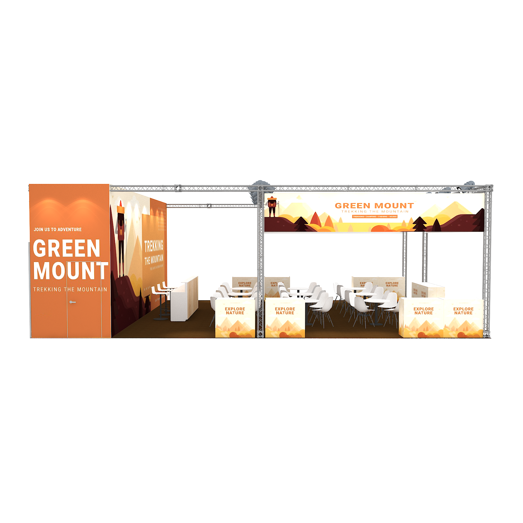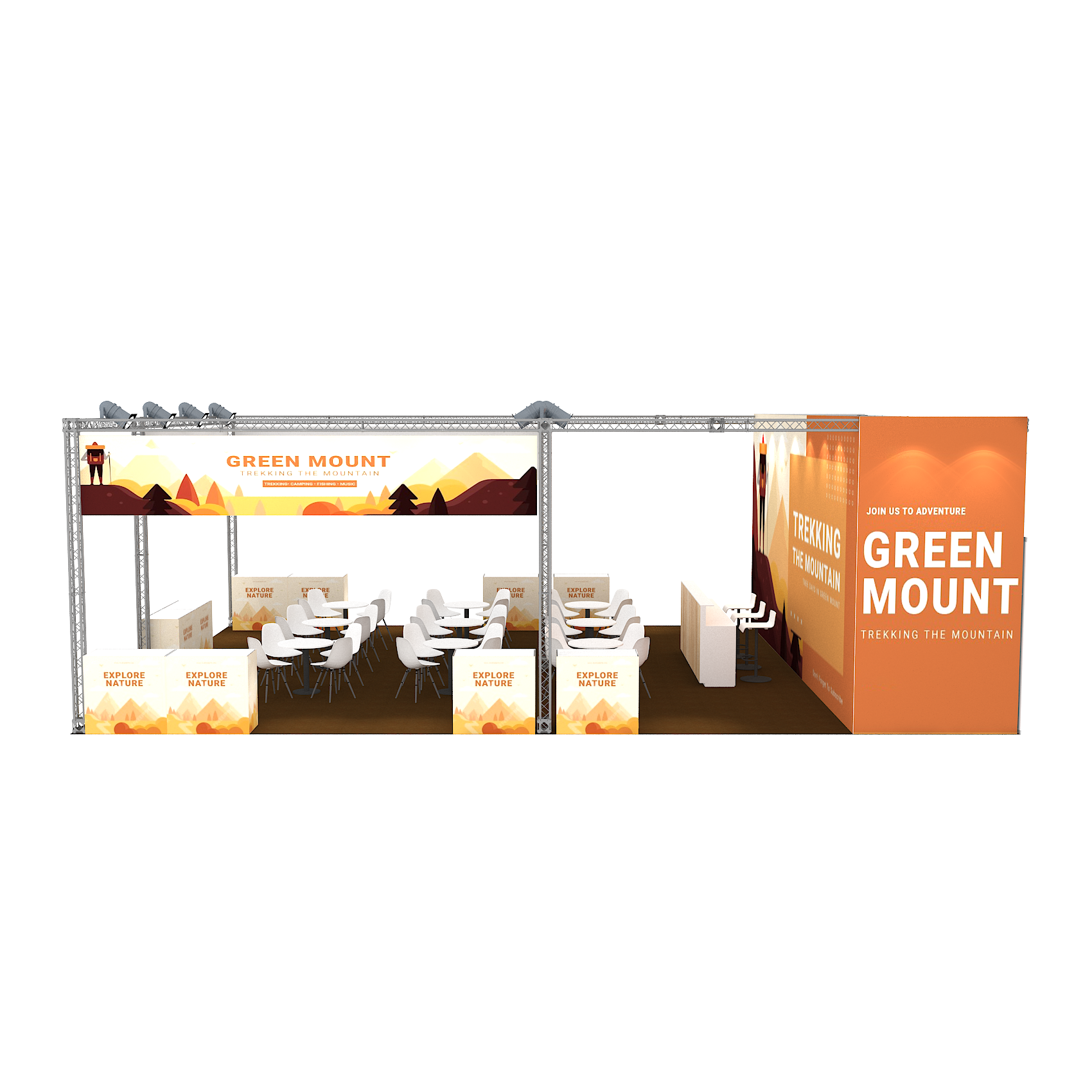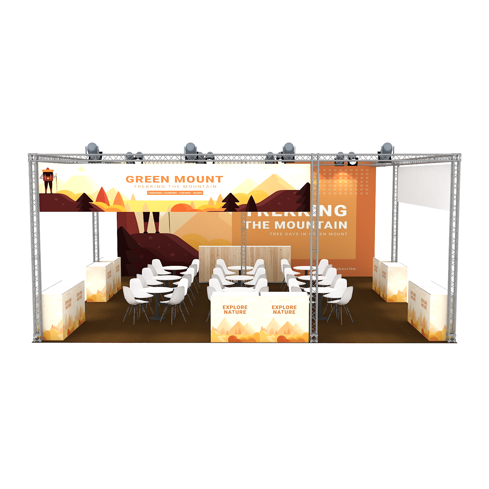 套裝攤位裝潢包含以下: • 攤位大小:900X1200cm • 展位高度:400cm • 大圖輸出:1式 • 組合隔間:1式 • TRUSS燈柱:1式 • 地毯:(可選基本色系) • 70w燈具:32盞 • PAR燈:5盞 • 插座:2個(110V/5A) • 燈箱櫃台:3座 • 展櫃:10座 • 電視:1台 • 圓桌:9張 • 摺疊椅(黑):36張 • 吧檯椅:3張 • 木門:1組 • 進撤場施工(林口以南需加車資)