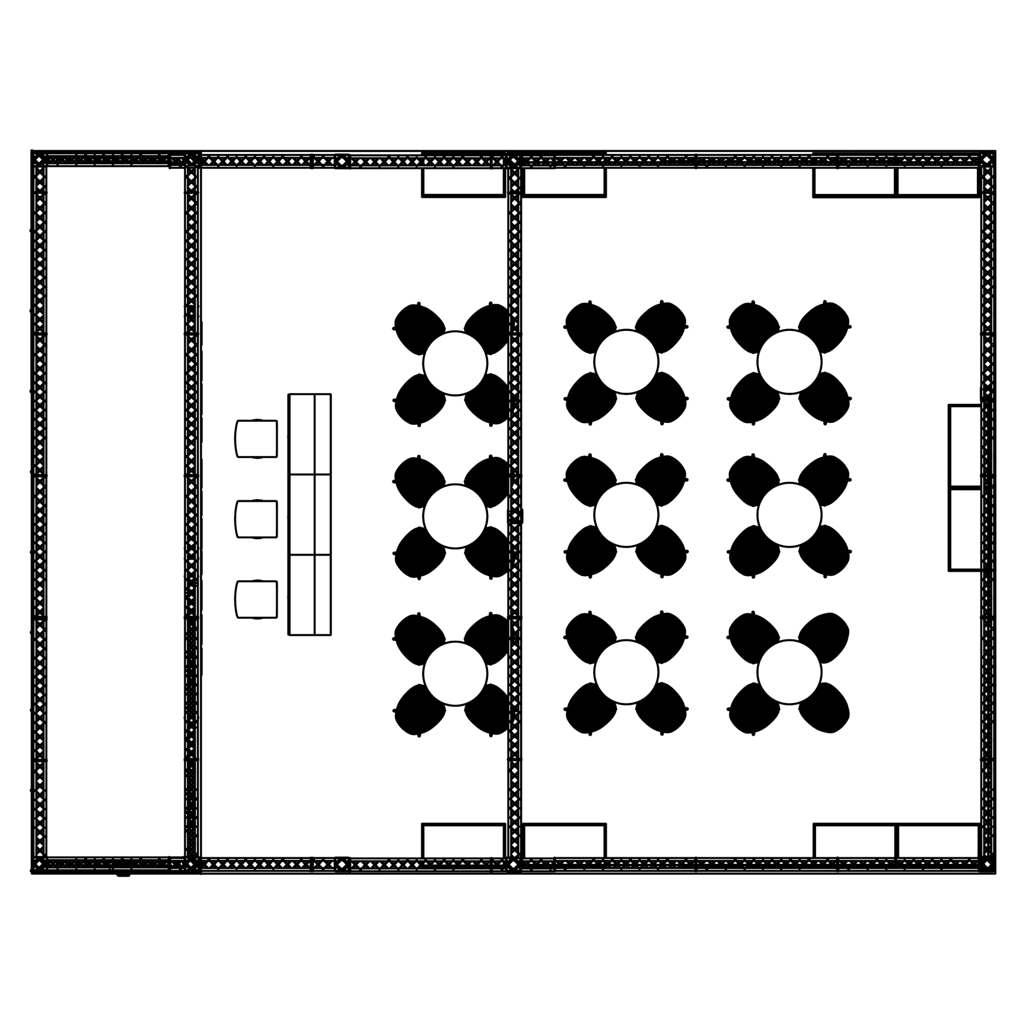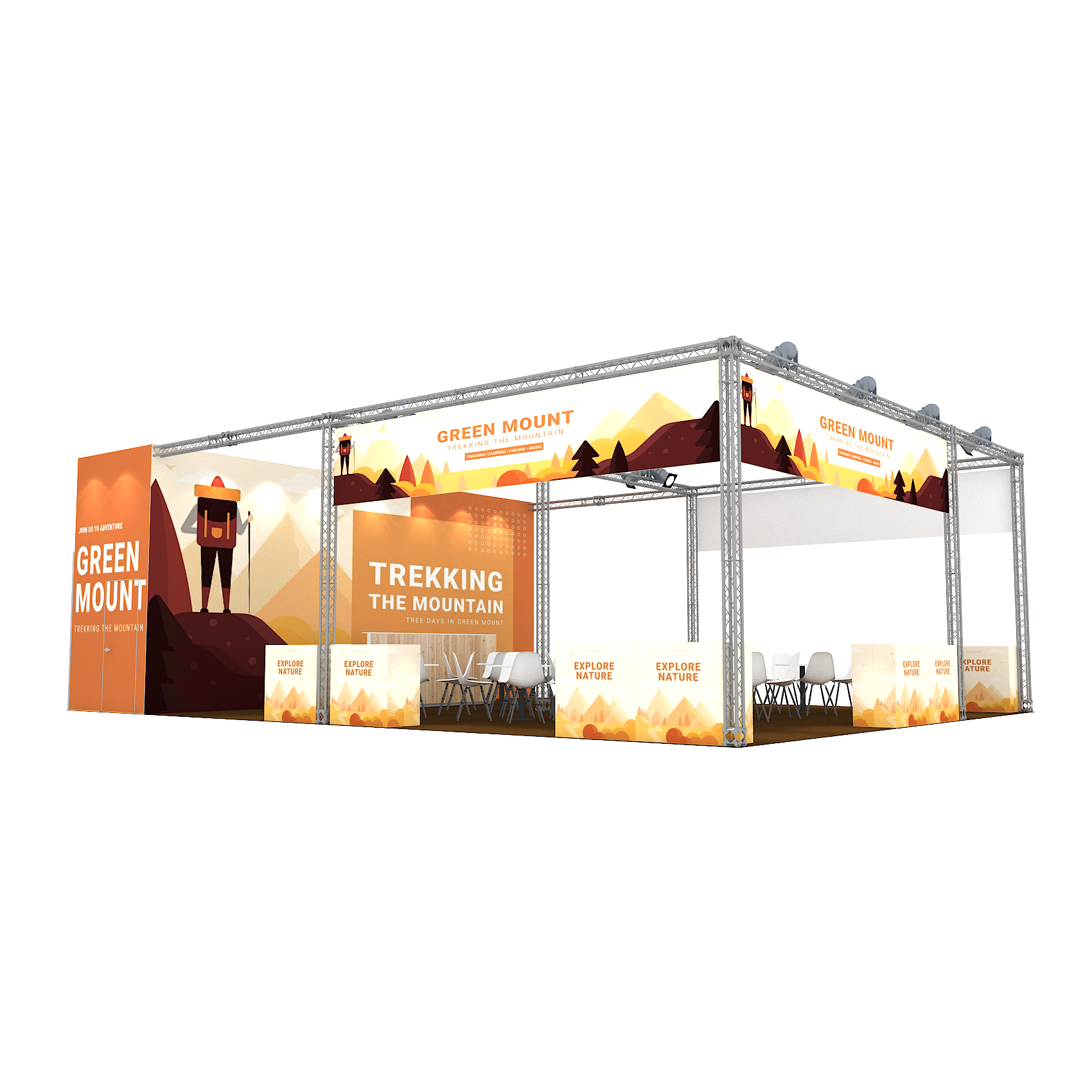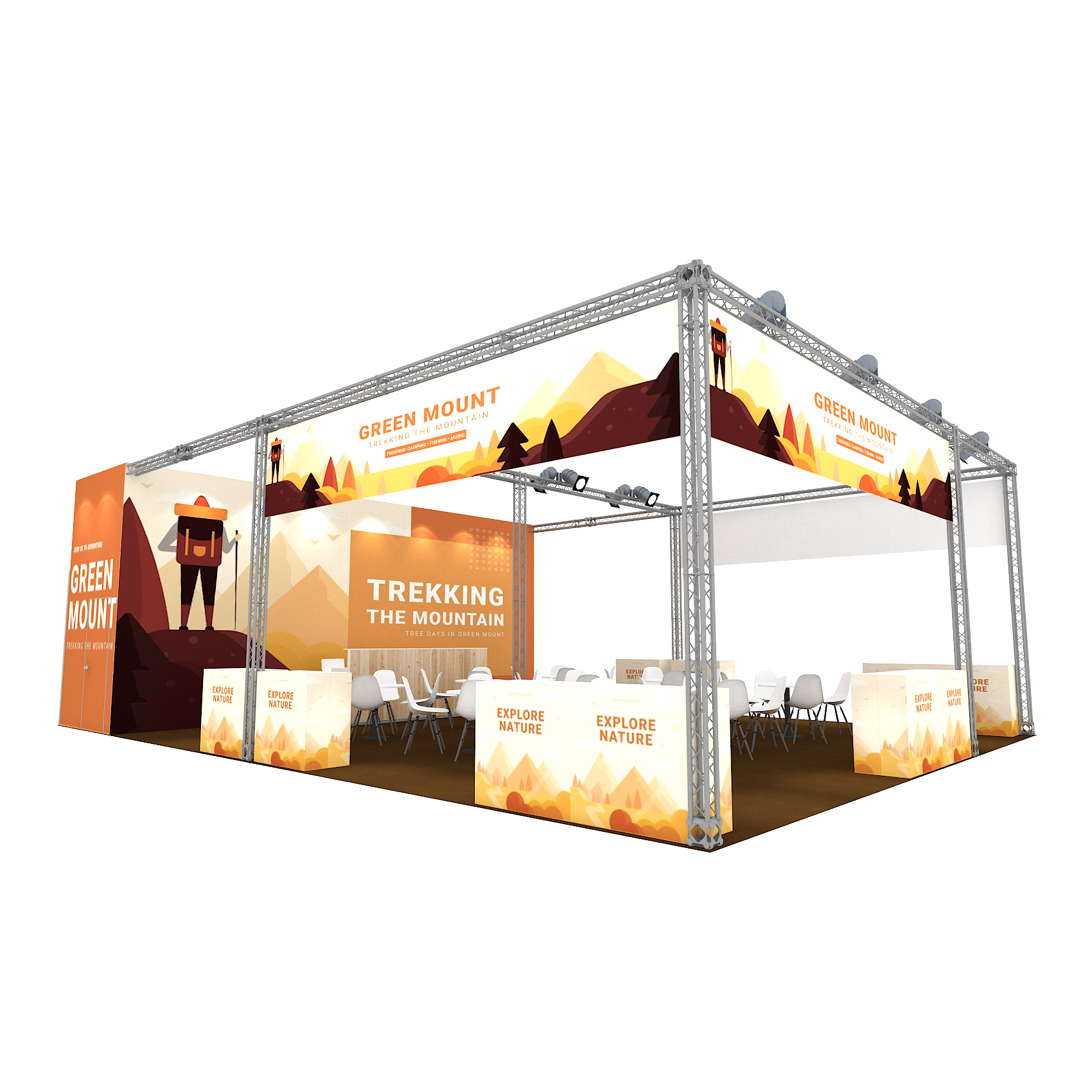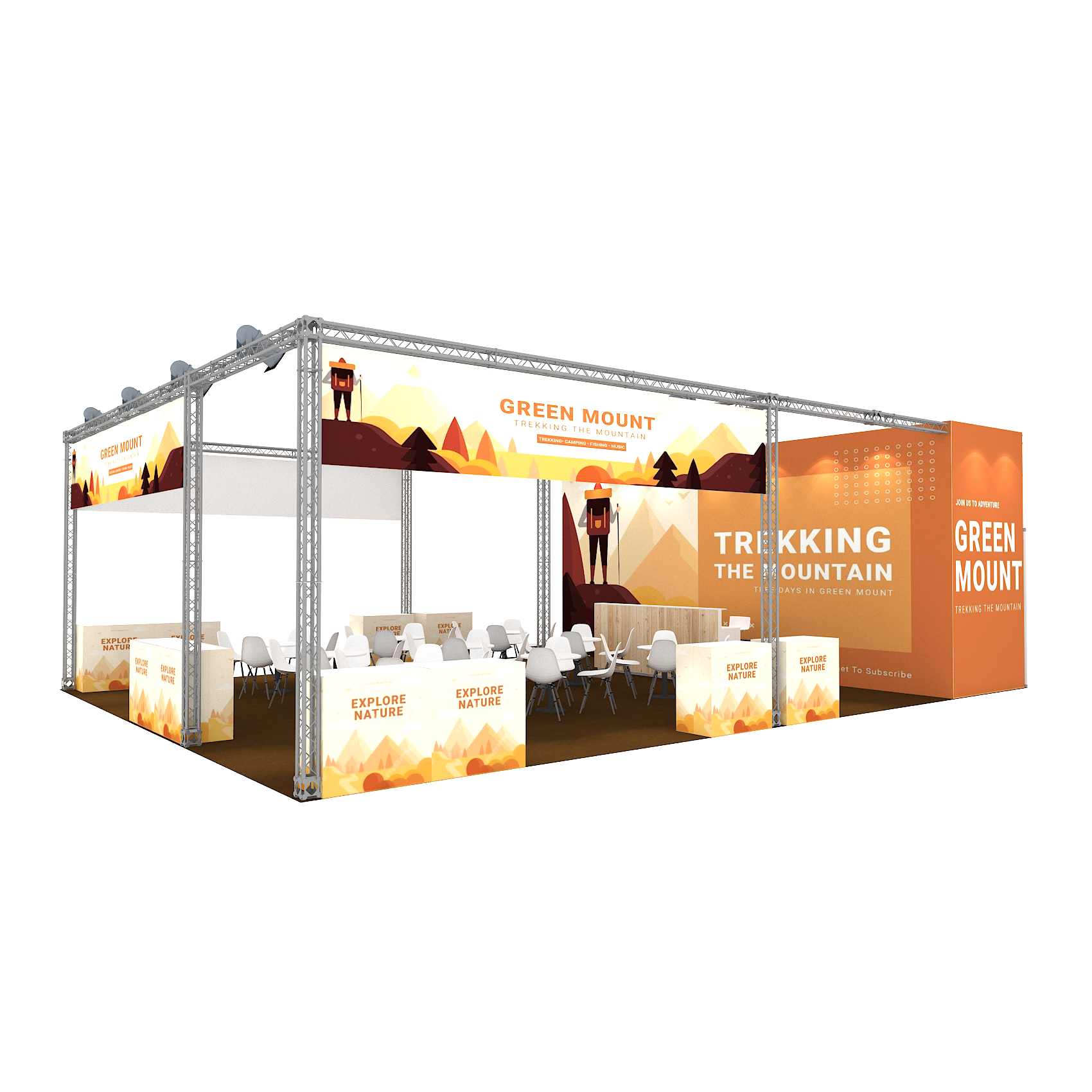 套裝攤位裝潢包含以下: • 攤位大小:900X1200cm • 展位高度:400cm • 大圖輸出:1式 • 組合隔間:1式 • TRUSS燈柱:1式 • 地毯:(可選基本色系) • 70w燈具:32盞 • PAR燈:5盞 • 插座:2個(110V/5A) • 燈箱櫃台:3座 • 展櫃:10座 • 電視:1台 • 圓桌:9張 • 摺疊椅(黑):36張 • 吧檯椅:3張 • 木門:1組 • 進撤場施工(林口以南需加車資)