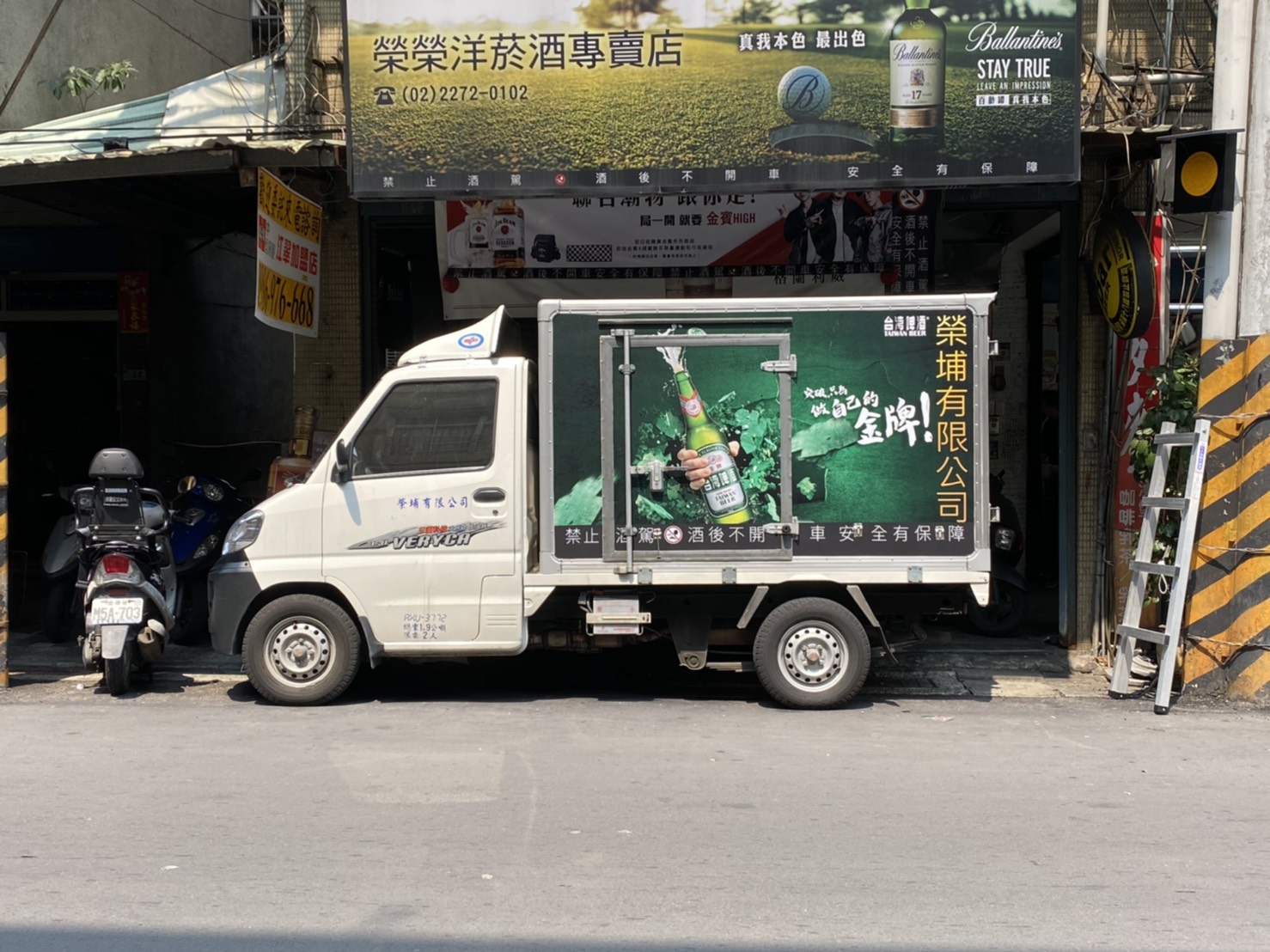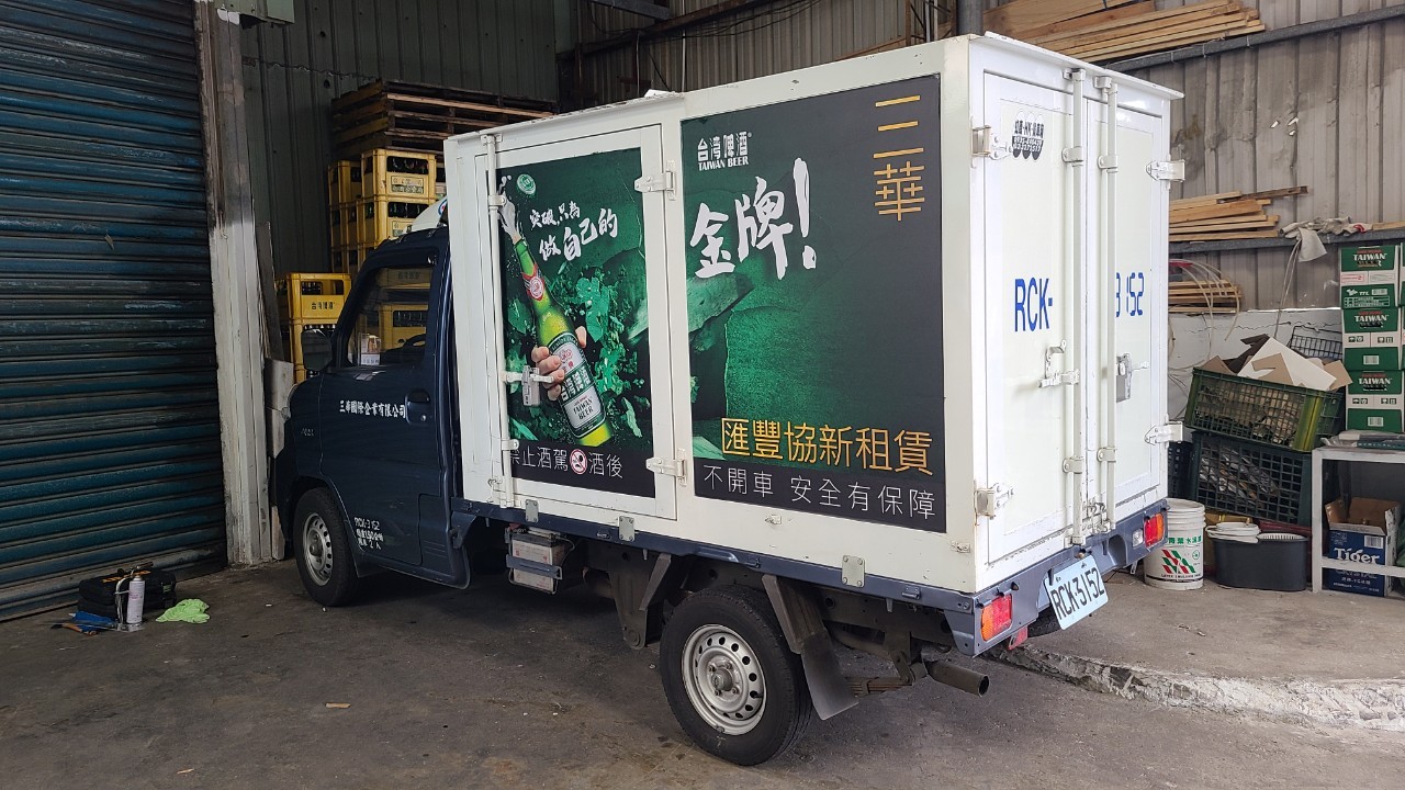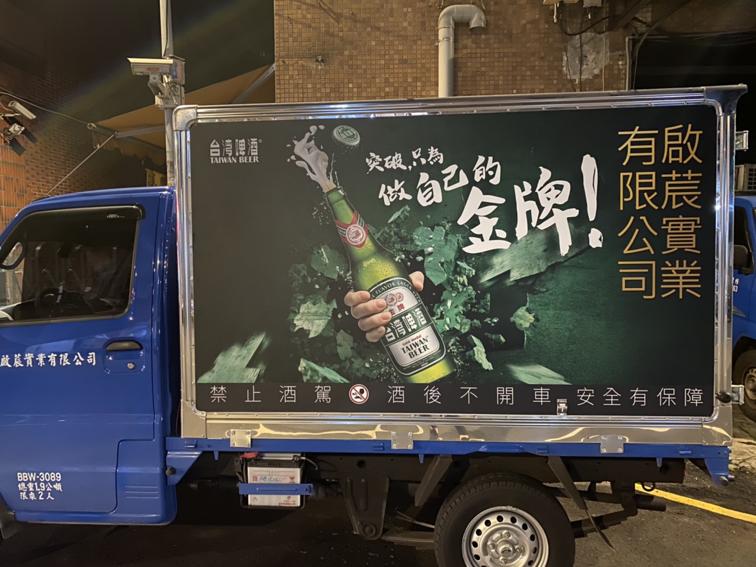 貨車車廂貼上廣告,馬上變身成行動式廣告車,產品宣傳度立即提升不少,台灣啤酒公司就是運用這樣的方式,成功打入消費者的內心,年年產品都非常暢銷,很榮幸金剛廣告製作能夠幫臺灣啤酒製作這一系列的廣告車貼,從尺寸丈量、圖稿設計到車身貼紙印製與北區各處經銷商聯絡與施工,一條龍的完成所有服務。